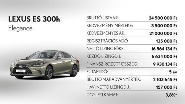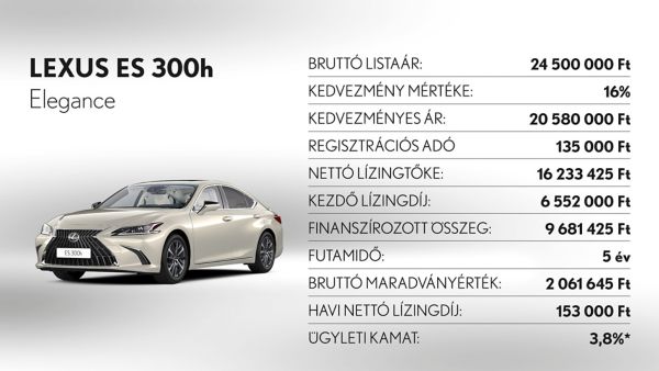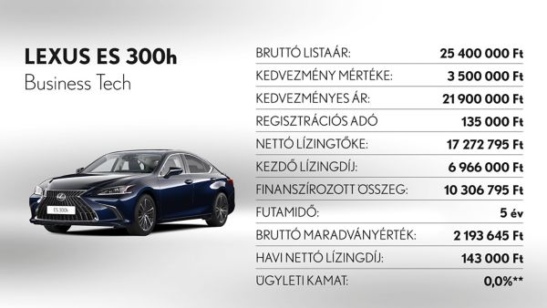**Ajánlatunk 2025. november 3 - december 31. között vagy visszavonásig megkötött lízingszerződésekre érvényes, kizárólag készleten lévő Lexus ES300h, UX300h és RZ modellekre. A finanszírozási ajánlat alapja a Toyota Pénzügyi Zrt. üzleti (fogyasztónak nem minősülő) ügyfeleknek szóló forint alapú, rögzített kamatozású nyíltvégű pénzügyi lízing kalkulációja, ami teljes körű casco biztosítás megkötése és teljes futamidő alatti fenntartása esetén érvényes, Lexus Privilege Programban. Feltételek – minimum önerő: 30%, futamidő: 36-60 hónap, minimum finanszírozott összeg: 6.000.000 Ft. THM: 0,1%, Ügyleti kamat: 0,0%.