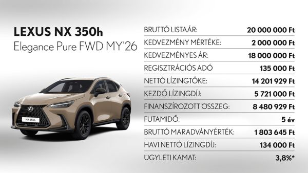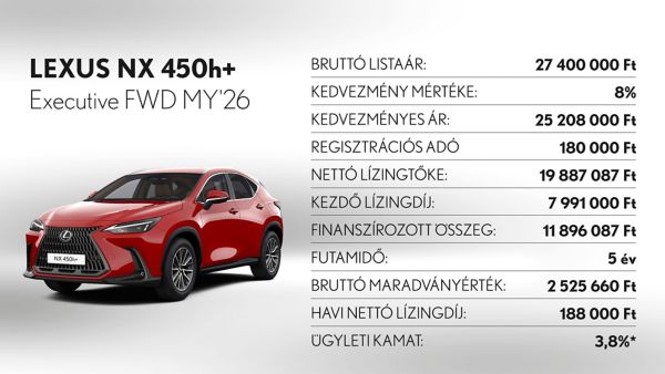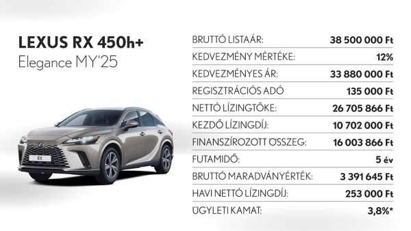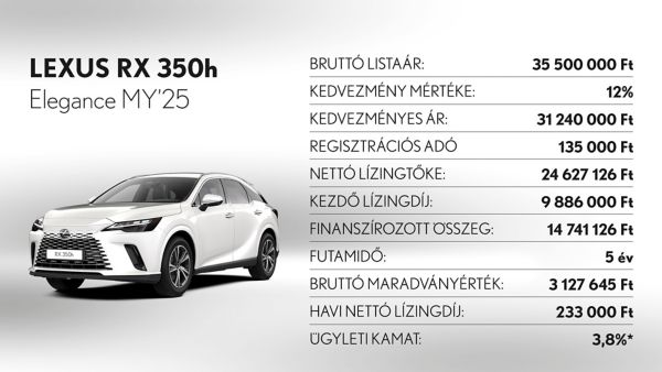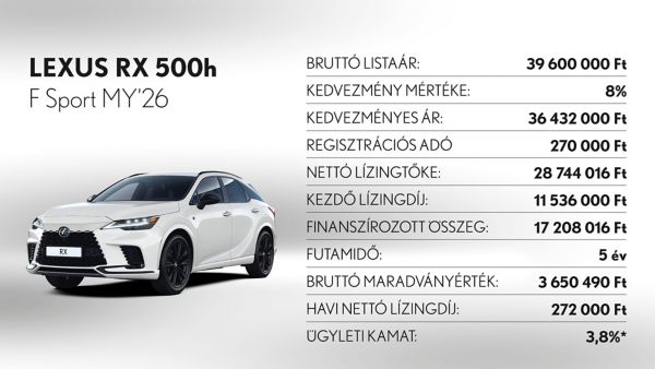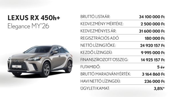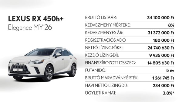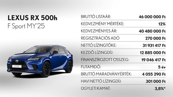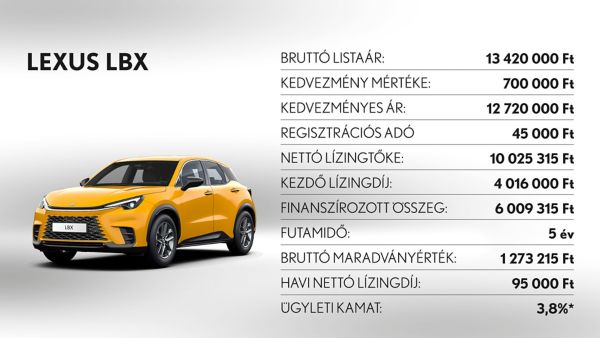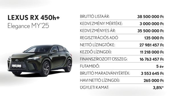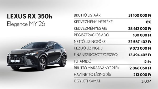 *Ajánlatunk 2025. november 3 - december 31. között vagy visszavonásig megkötött lízingszerződésekre érvényes, kizárólag Lexus LBX, UX300h, ES300h, NX350h, NX450h+, RX350h, RX450h+, RX500h és RZ modellekre. A finanszírozási ajánlat alapja a Toyota Pénzügyi Zrt. üzleti (fogyasztónak nem minősülő) ügyfeleknek szóló forint alapú, rögzített kamatozású nyíltvégű pénzügyi lízing kalkulációja, ami teljes körű casco biztosítás megkötése és teljes futamidő alatti fenntartása esetén érvényes, Lexus Privilege Programban. Feltételek – minimum önerő: 30%, futamidő: 36-60 hónap, minimum finanszírozott összeg: 5.000.000 Ft. THM: 3,2%, Ügyleti kamat: 3,8%.