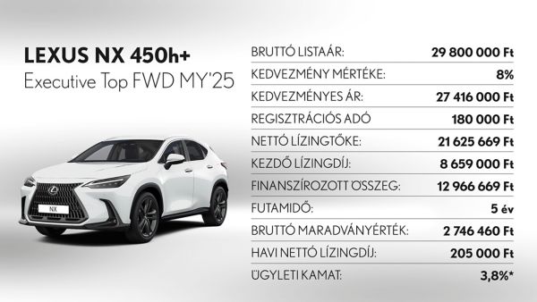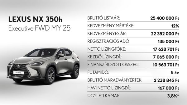 Lexus MY'25 NX 350h Executive FWD modellnél (5 éves futamidő mellett):
